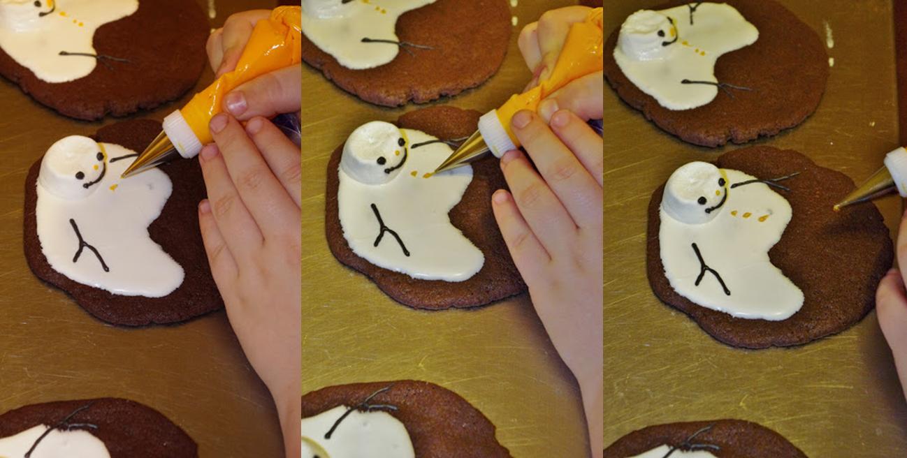 Cut the marshmallows in half and make the snowmen smaller. More chocolate cookie goodness but still the fun of the melted snowman. Perfect. I did the puddle of icing on the cookies and the hot marshmallow but Max was the artist with the piping bag.